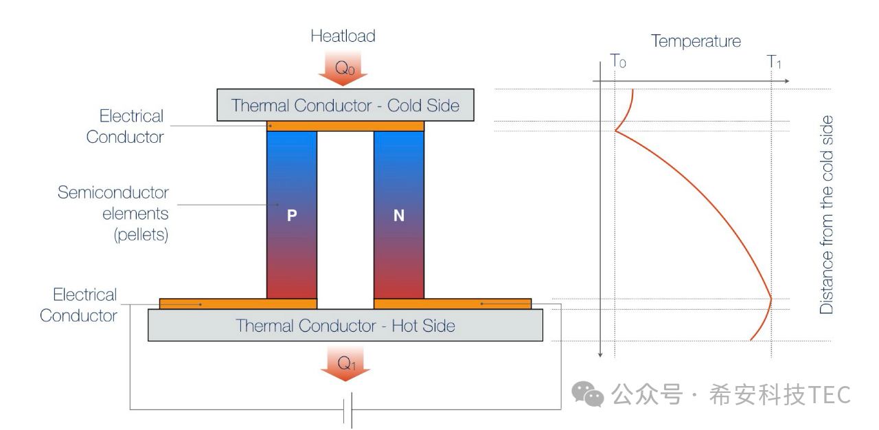 Termiska ledare läggs till i båda ändarna av termoelementet som visas i följande figur: en komplett TEC bildas. När TEC drivs kommer den övre ytan att absorbera värme, som kallas den kalla änden, och den absorberade värmen är Q0. Den nedre ytan avger värme och kallas den heta ytan, där värmen som frigörs är Q1 ; Q1= Q0+Qtec