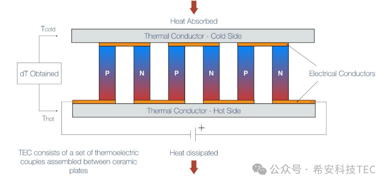 PN-övergången, genom det ledande lagret, bildar ett termoelement och är den centrala strukturella komponenten i TEC. Ett enda par termoelement kan också uppnå funktionerna kylning eller uppvärmning efter att ha slagits på.